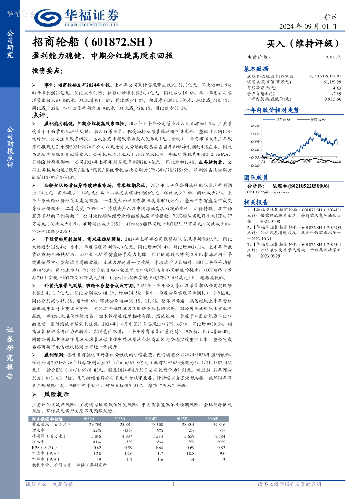 华福证券:招商轮船(601872)-盈利能力稳健,中期分红提高股东回报.pdf