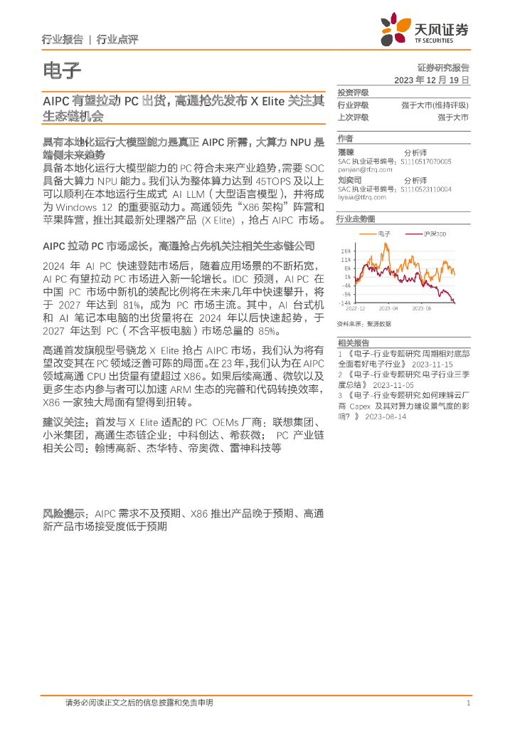 天风证券:电子:AIPC有望拉动PC出货,高通抢先发布X Elite关注其生态链机会.pdf