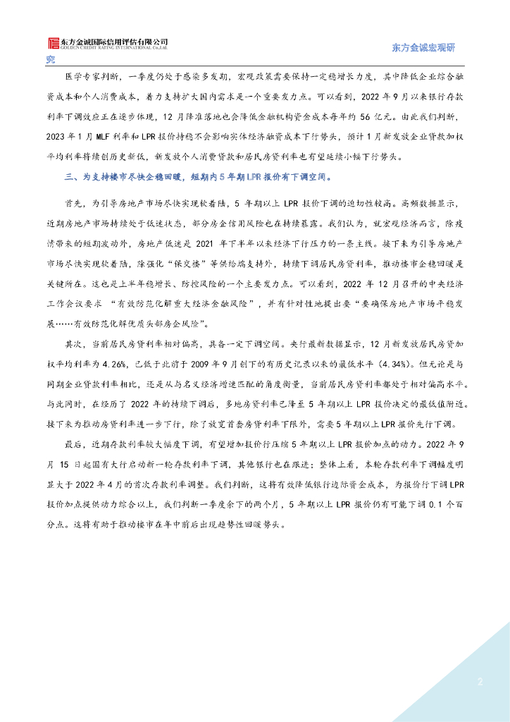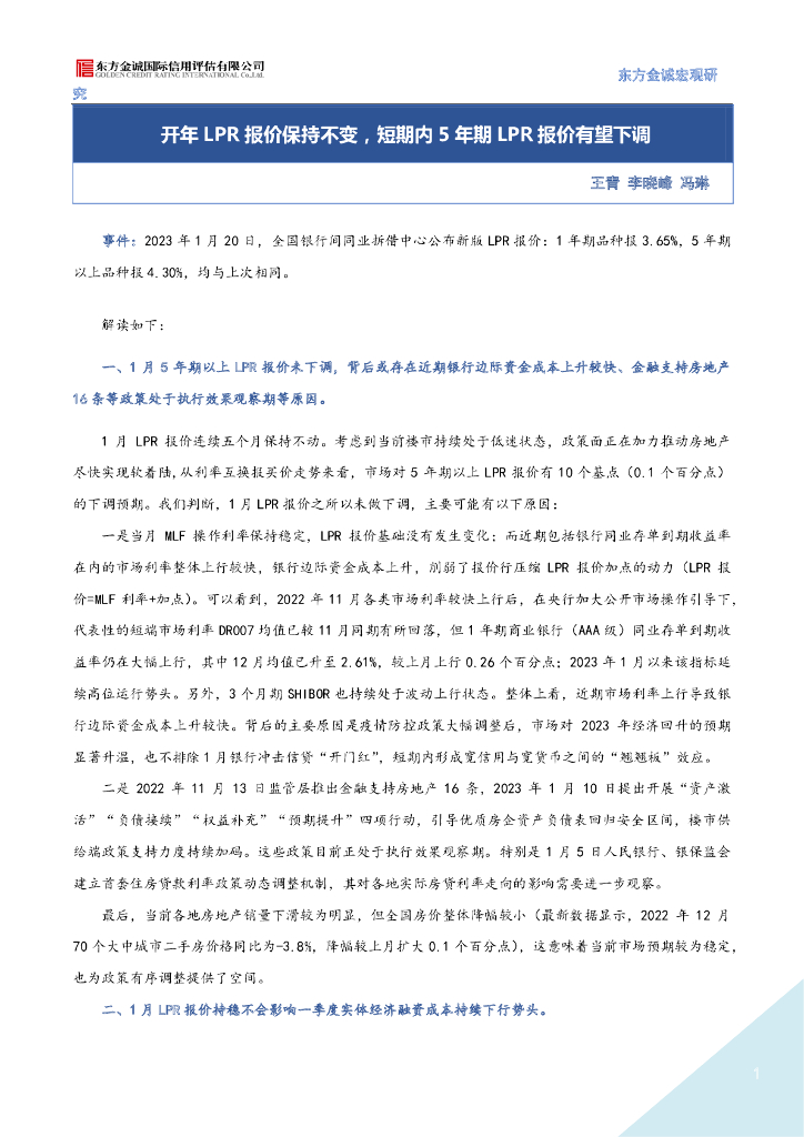 东方金诚:开年LPR报价保持不变,短期内5年期LPR报价有望下调(2023年1月LPR报价点评).pdf
