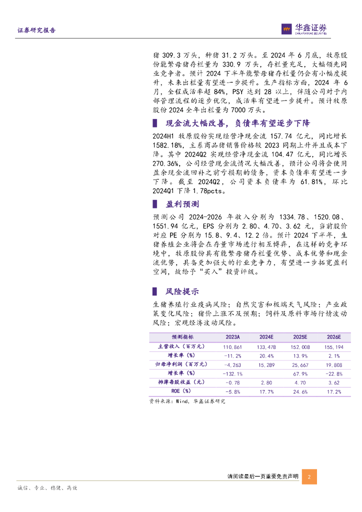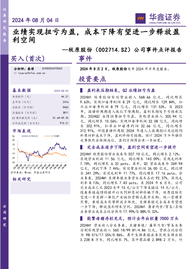 华鑫证券:牧原股份(002714)-公司事件点评报告:业绩实现扭亏为盈,成本下降有望进一步释放盈利空间.pdf