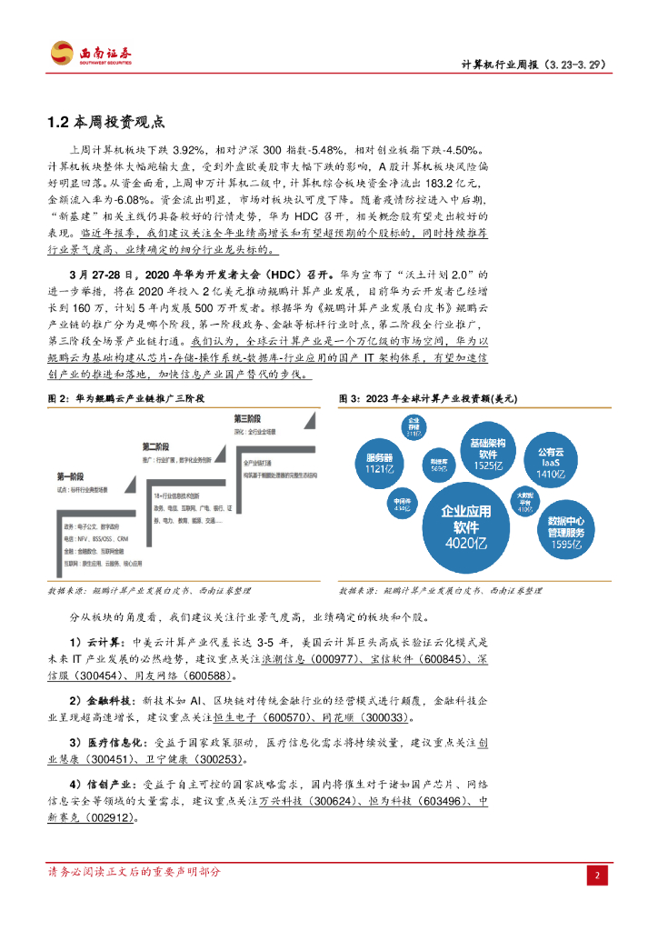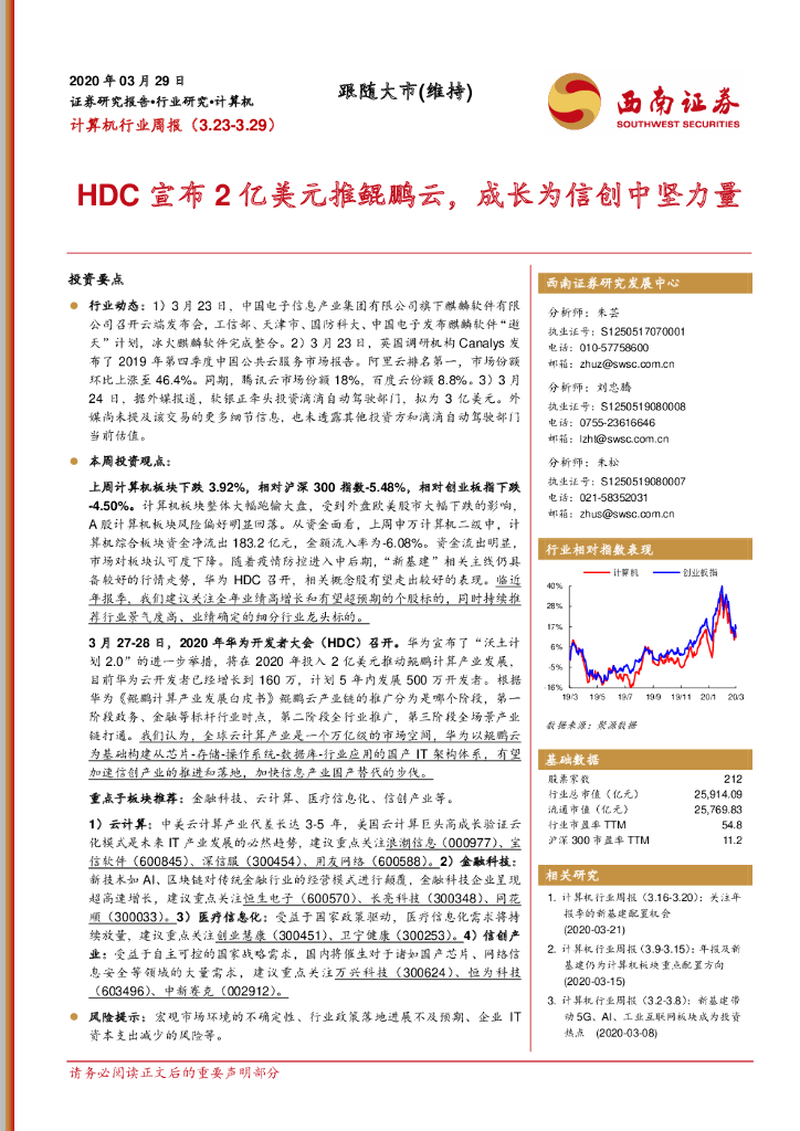 西南证券:计算机行业周报:HDC宣布2亿美元推鲲鹏云,成长为信创中坚力量.pdf