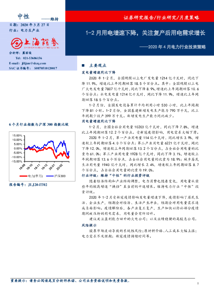 上海证券:2020年4月电力行业投资策略:1-2月用电增速下降,关注复产后用电需求增长.pdf