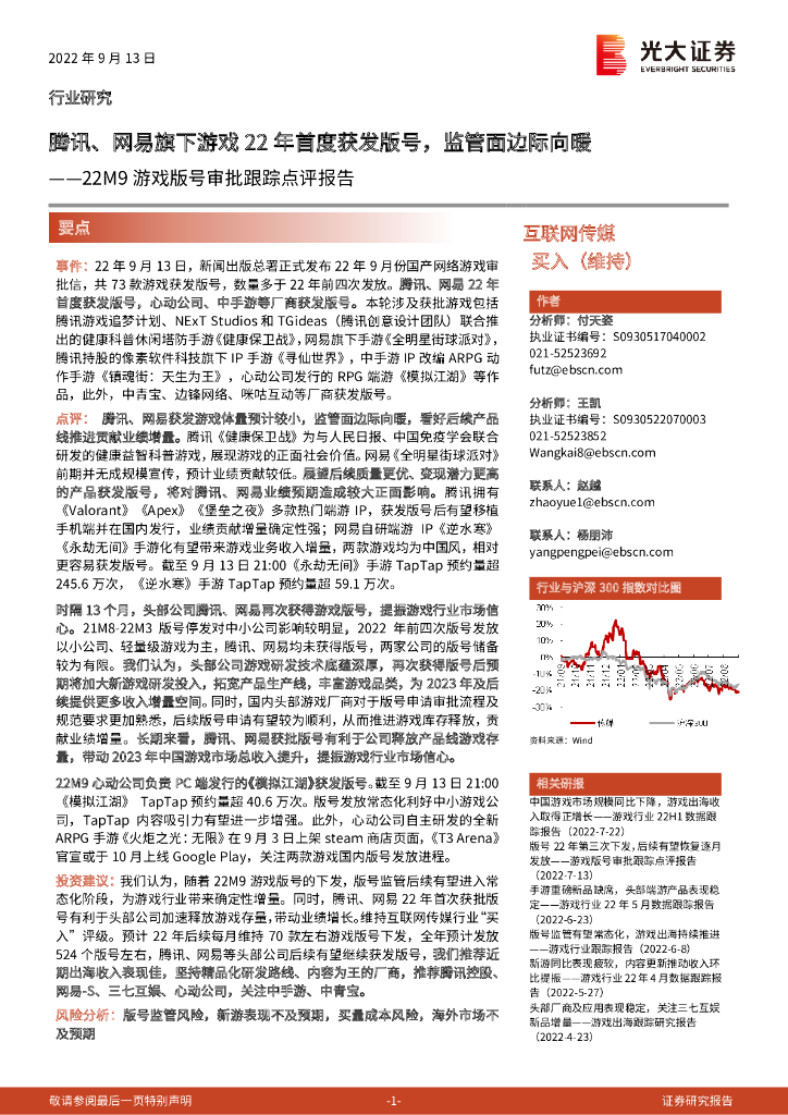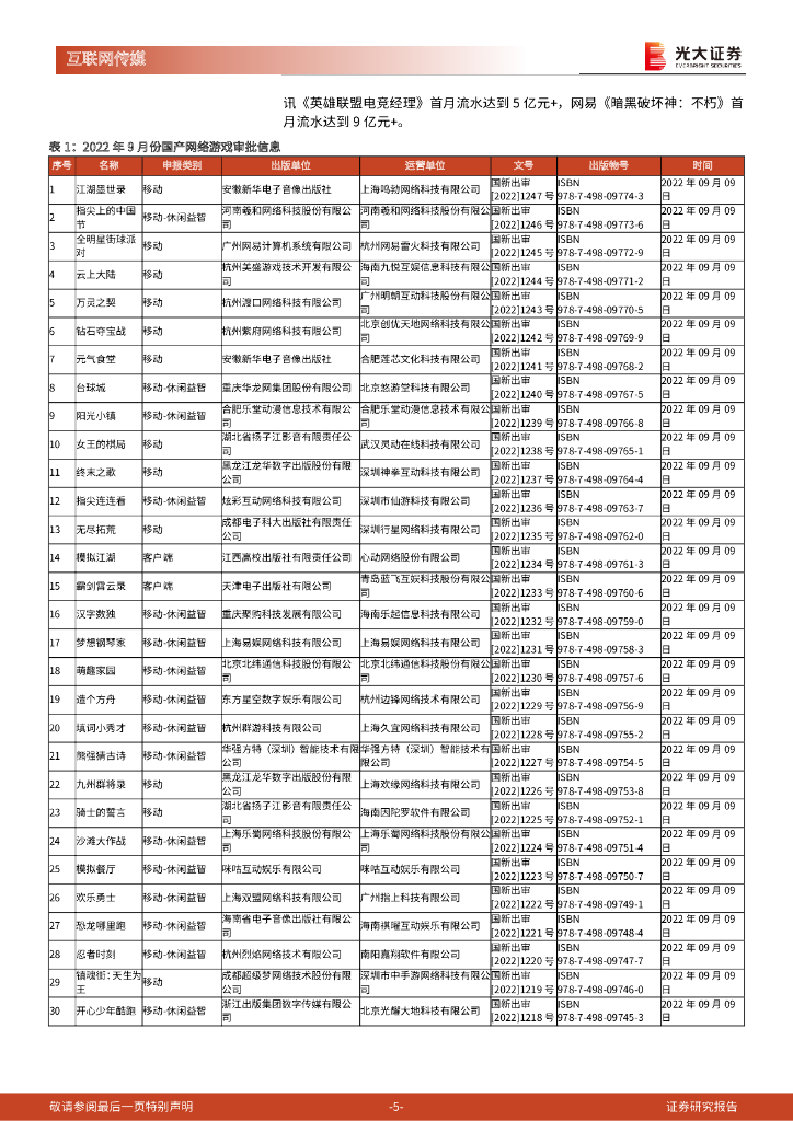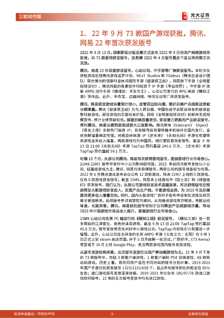 光大证券:互联网传媒:22M9游戏版号审批跟踪点评报告-腾讯、网易旗下游戏22年首度获发版号,监管面边际向暖.pdf