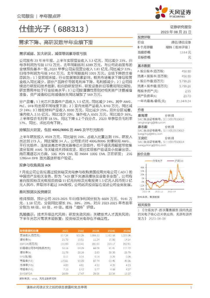 天风证券:仕佳光子(688313)-需求下降、高研发致半年业绩下滑.pdf