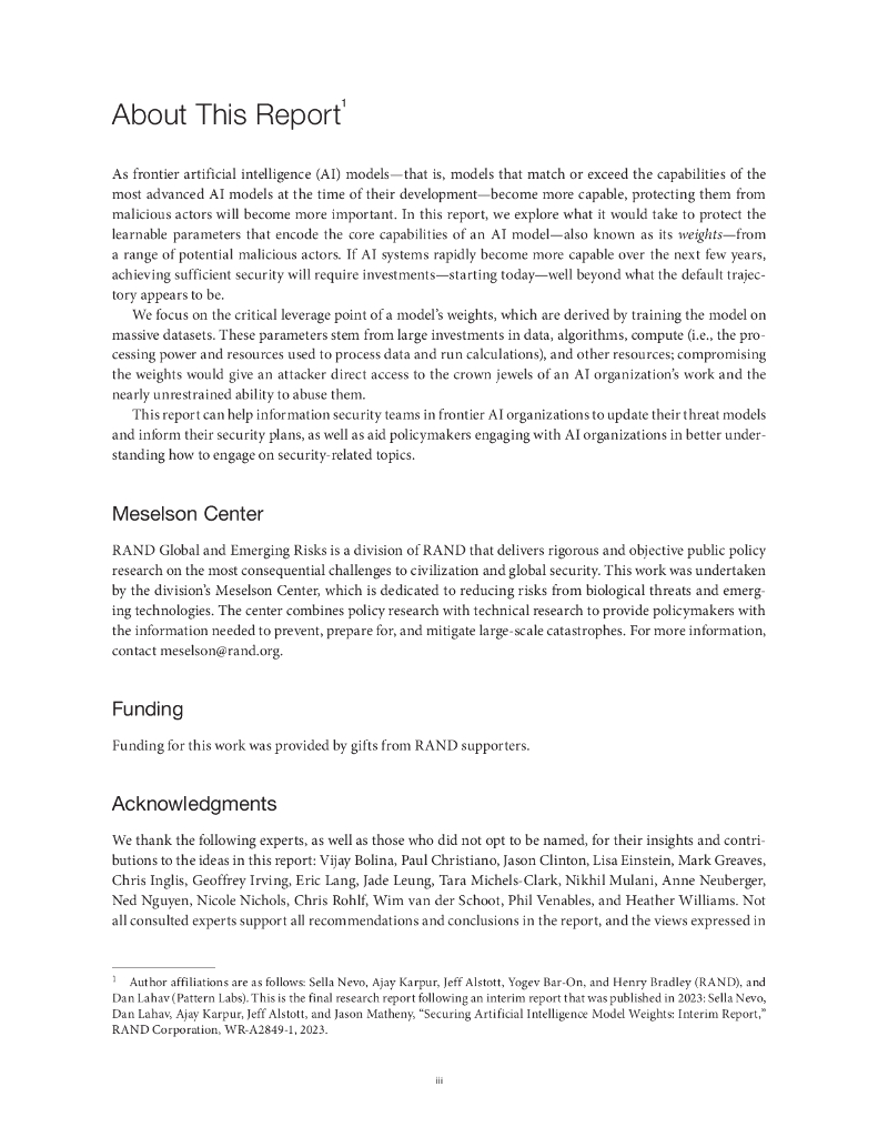 Rand兰德:2024保护人工智能模型权重研究报告:防止前沿模型被盗和滥用(英文版).pdf