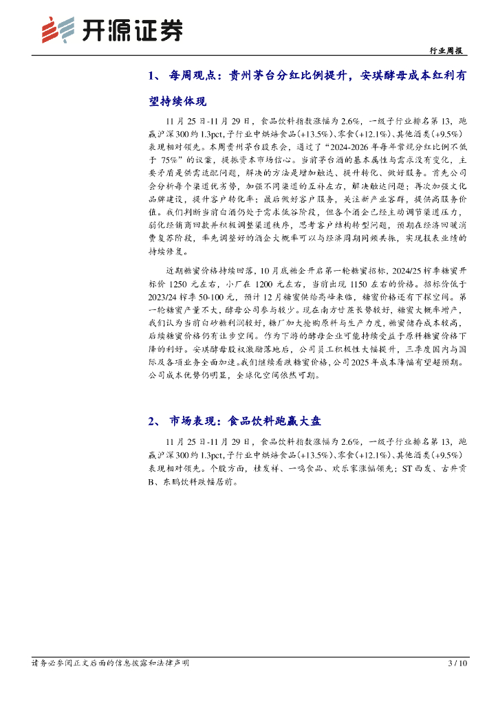 开源证券:食品饮料行业周报:茅台增厚股东回报,糖蜜价格持续回落.pdf