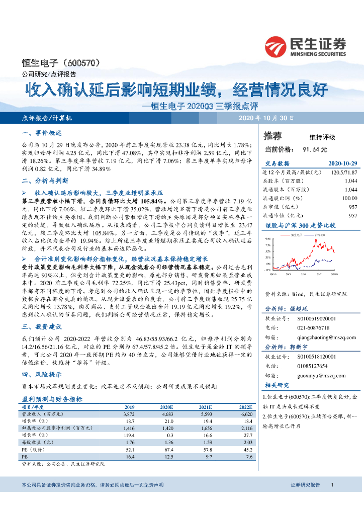 民生证券:恒生电子2020Q3三季报点评:收入确认延后影响短期业绩,经营情况良好.pdf