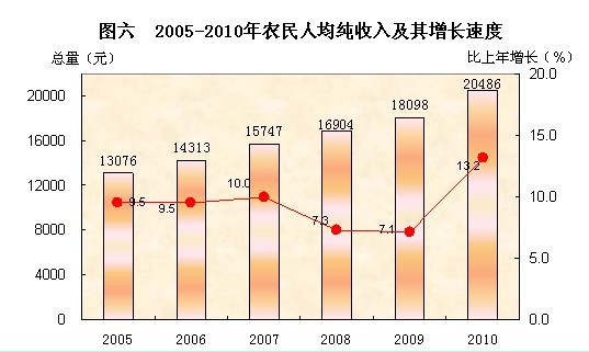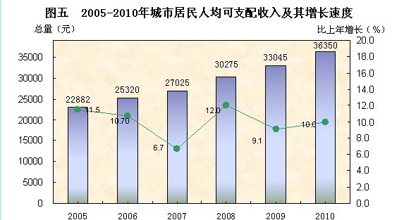 2010年全市职工年平均工资16108元,比上年增长 11.7%。城镇在岗职工年平均工资46576元,增长9.4%。城市居民人均可支配收入36350元,农村居民人均纯收入20486元,分别比上年增长10.0%和13.2%。