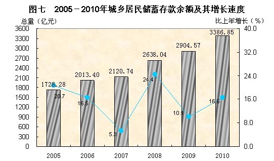 年末全市城乡居民人民币储蓄存款余额3386.85亿元,比年初增加500.41亿元。其中,定期储蓄存款余额1354.23亿元,增加88.66亿元;活期储蓄存款余额2032.62亿元,增加411.75亿元。