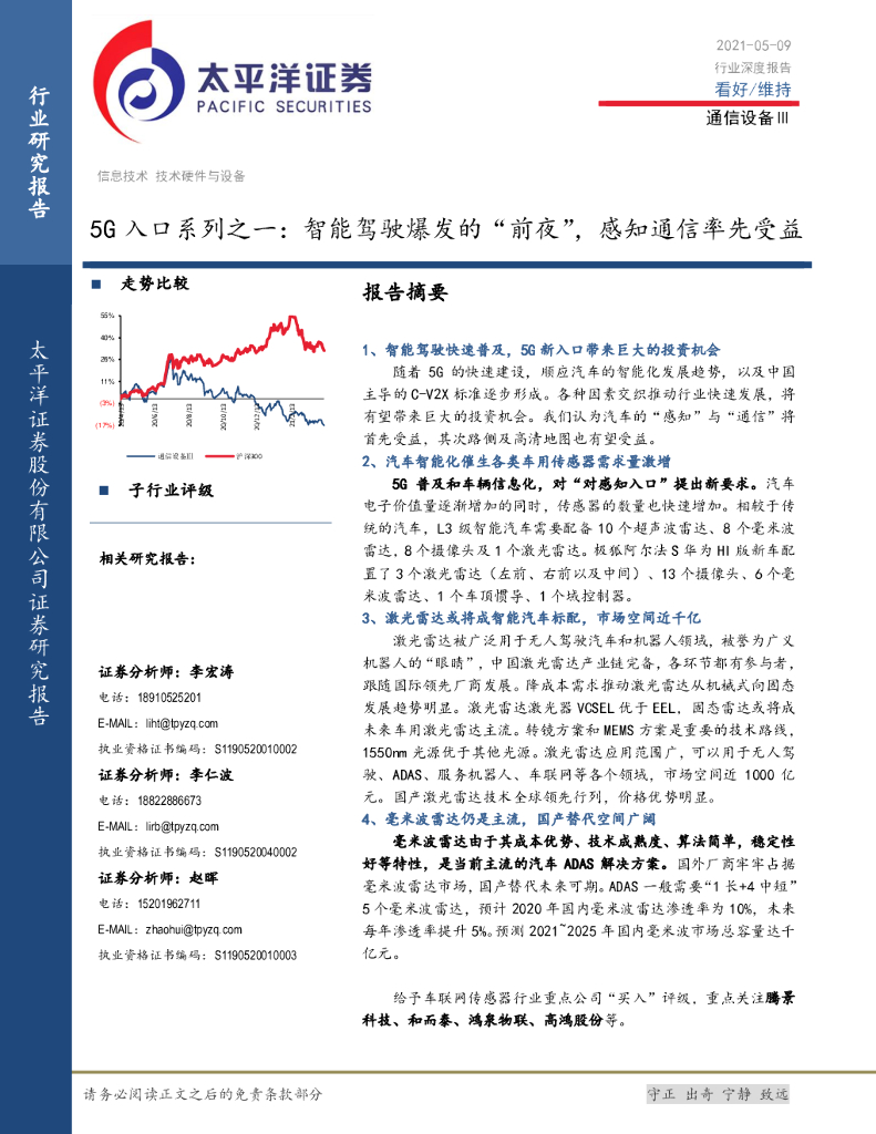 太平洋证券:通信设备行业深度报告:5G入口系列之一:智能驾驶爆发的“前夜”,感知通信率先受益.pdf