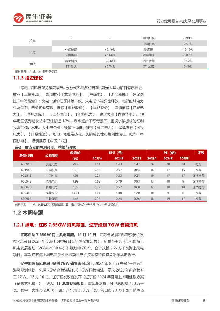 民生证券:电力及公用事业行业周报(24WK51):海风竞配高景气,山东存量风电仍保量90%.pdf