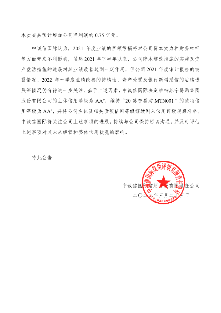 中诚信:中诚信国际关于将苏宁易购集团股份有限公司主体及相关债项信用等级继续列入信用评级观察名单的公告.pdf