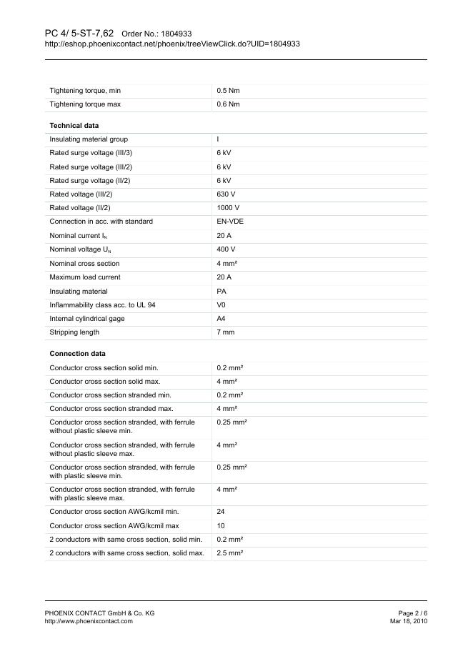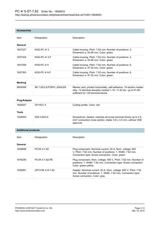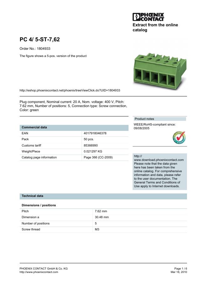 PHOENIX CONTACT PC 4/ 5-ST-7,62 Order No.: 1804933 The figure shows a 5-pos. version of the product 数据手册.pdf