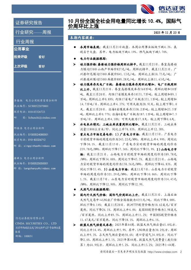 信达证券:公用事业-电力天然气行业周报:10月份全国全社会用电量同比增长10.4%,国际气价周环比上涨.pdf