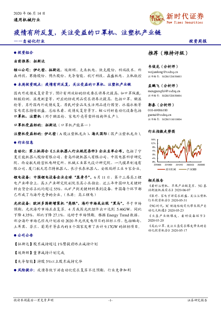新时代证券:自动化行业投资周报:疫情有所反复,关注受益的口罩机、注塑机产业链.pdf