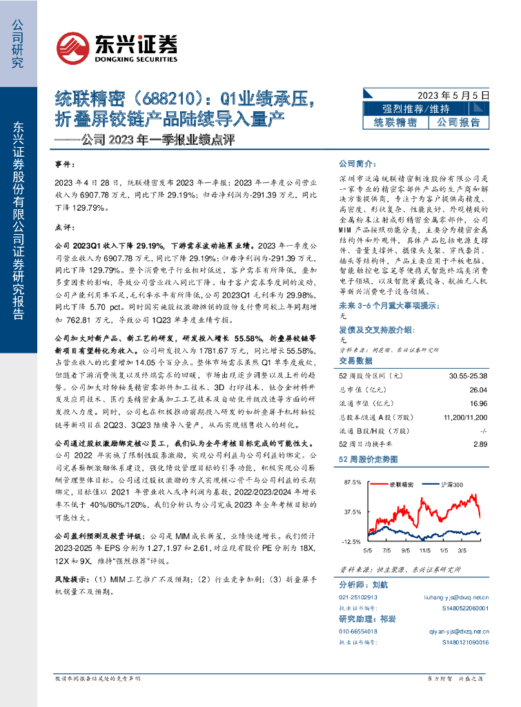 东兴证券:统联精密(688210)-公司2023年一季报业绩点评:Q1业绩承压,折叠屏铰链产品陆续导入量产.pdf