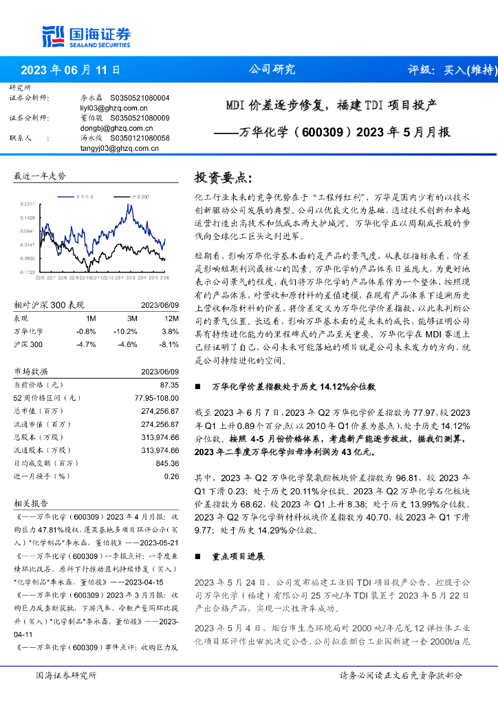 国海证券:万华化学(600309)-2023年5月月报:MDI价差逐步修复,福建TDI项目投产.pdf