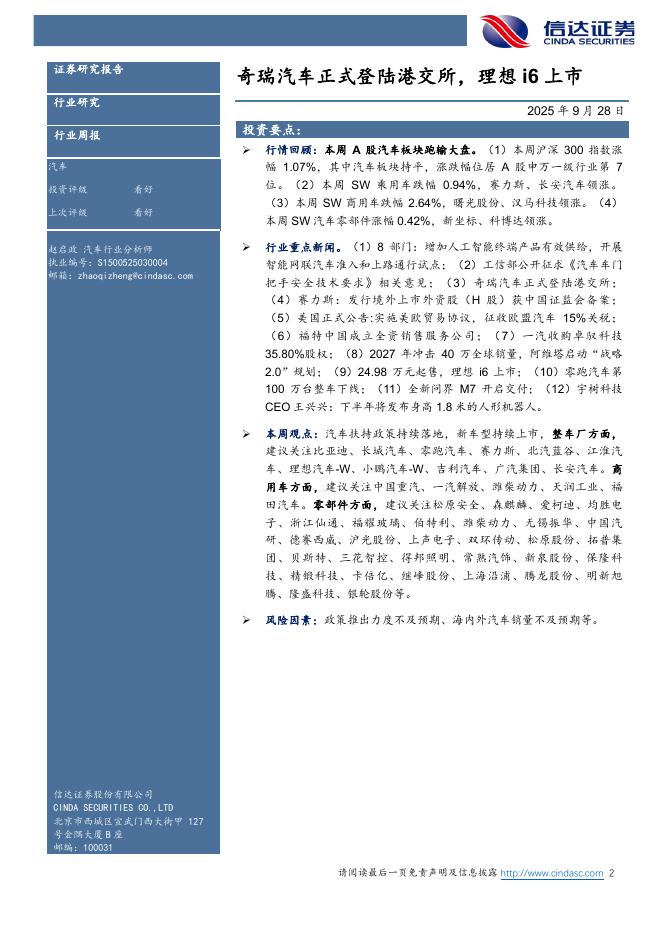 信达证券:奇瑞汽车正式登陆港交所,理想i6上市汽车周报.pdf