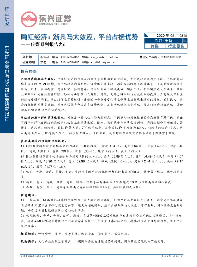 东兴证券:传媒系列报告之6:网红经济:渐具马太效应,平台占据优势.pdf