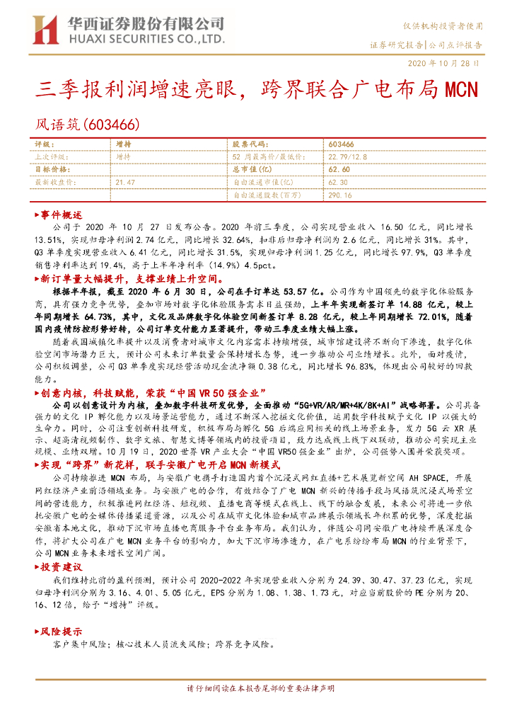 华西证券:风语筑(603466)-三季报利润增速亮眼,跨界联合广电布局MCN.pdf