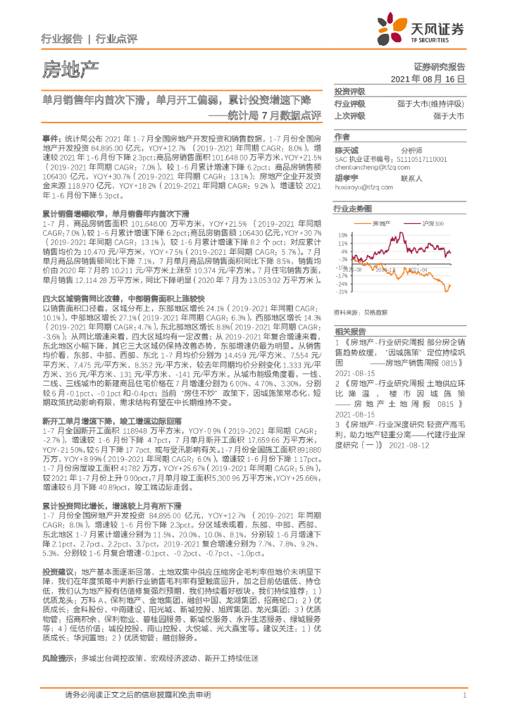 天风证券:房地产统计局7月数据点评:单月销售年内首次下滑,单月开工偏弱,累计投资增速下降.pdf