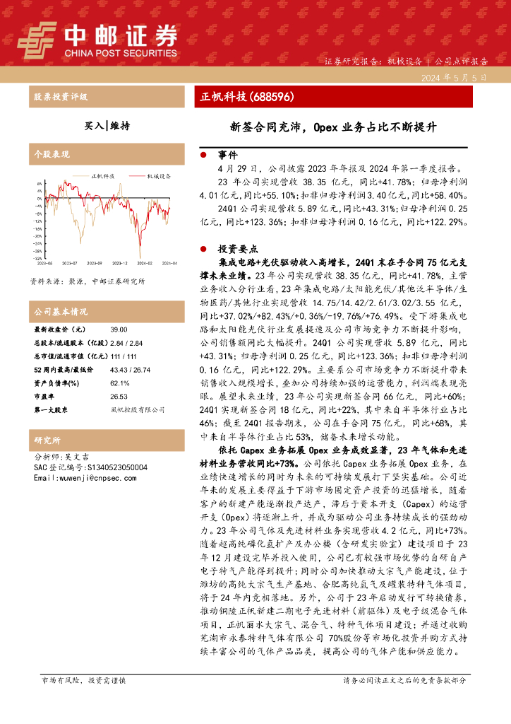 中邮证券:正帆科技(688596)-新签合同充沛,Opex业务占比不断提升.pdf