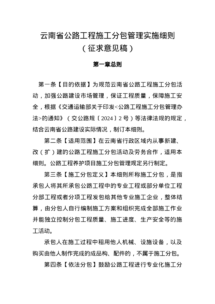 云南省公路工程施工分包管理实施细则(征求意见稿).doc