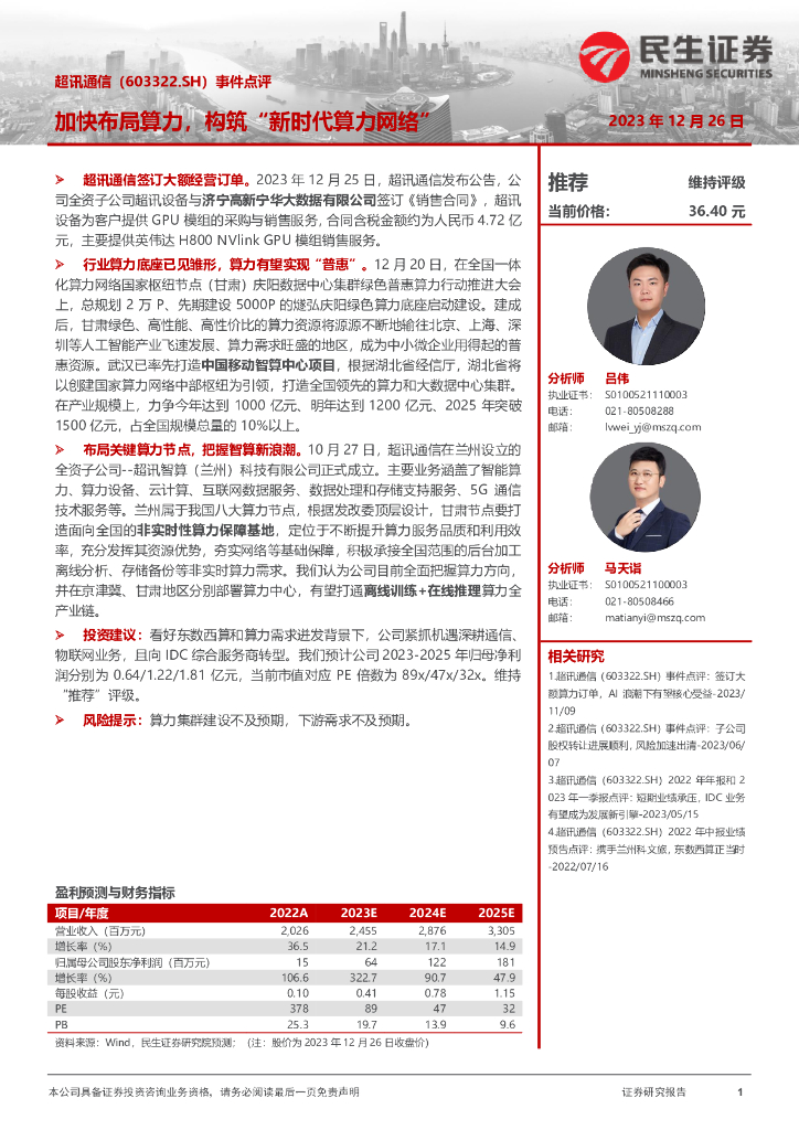 民生证券:超讯通信(603322)-事件点评:加快布局算力,构筑“新时代算力网络”.pdf