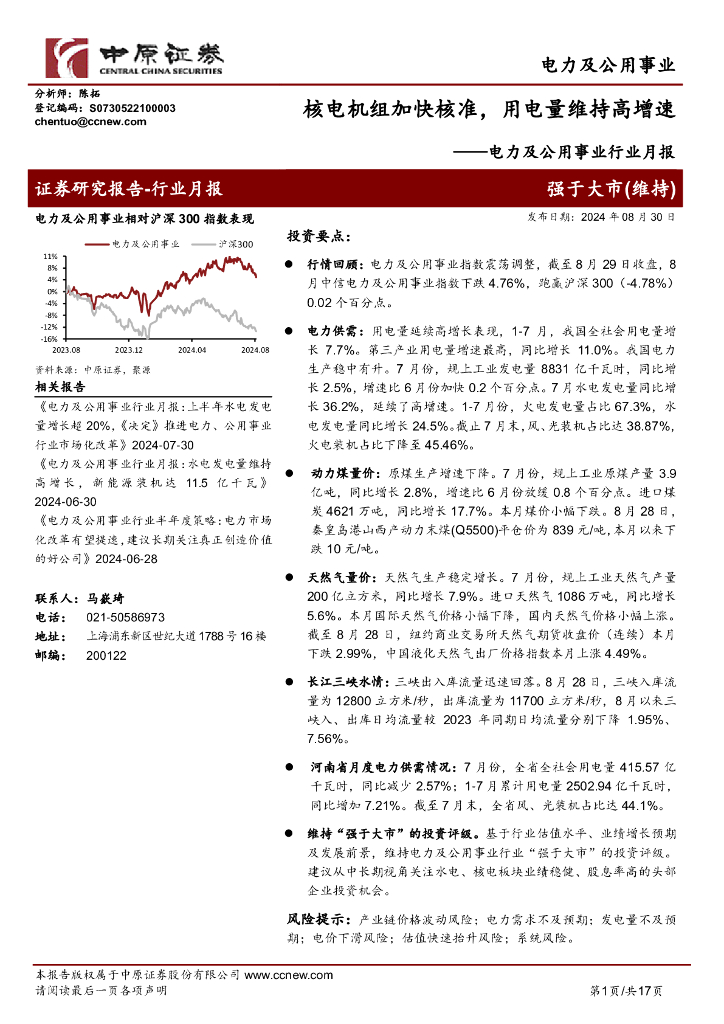 中原证券:电力及公用事业行业月报:核电机组加快核准:用电量维持高增速.pdf