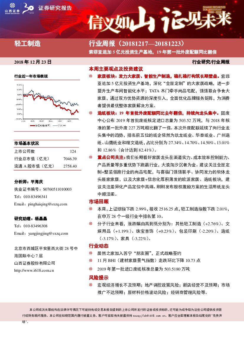 山西证券:轻工制造行业周报:索菲亚追加5亿元投资生产基地,19年第一批外废配额同比翻倍.pdf