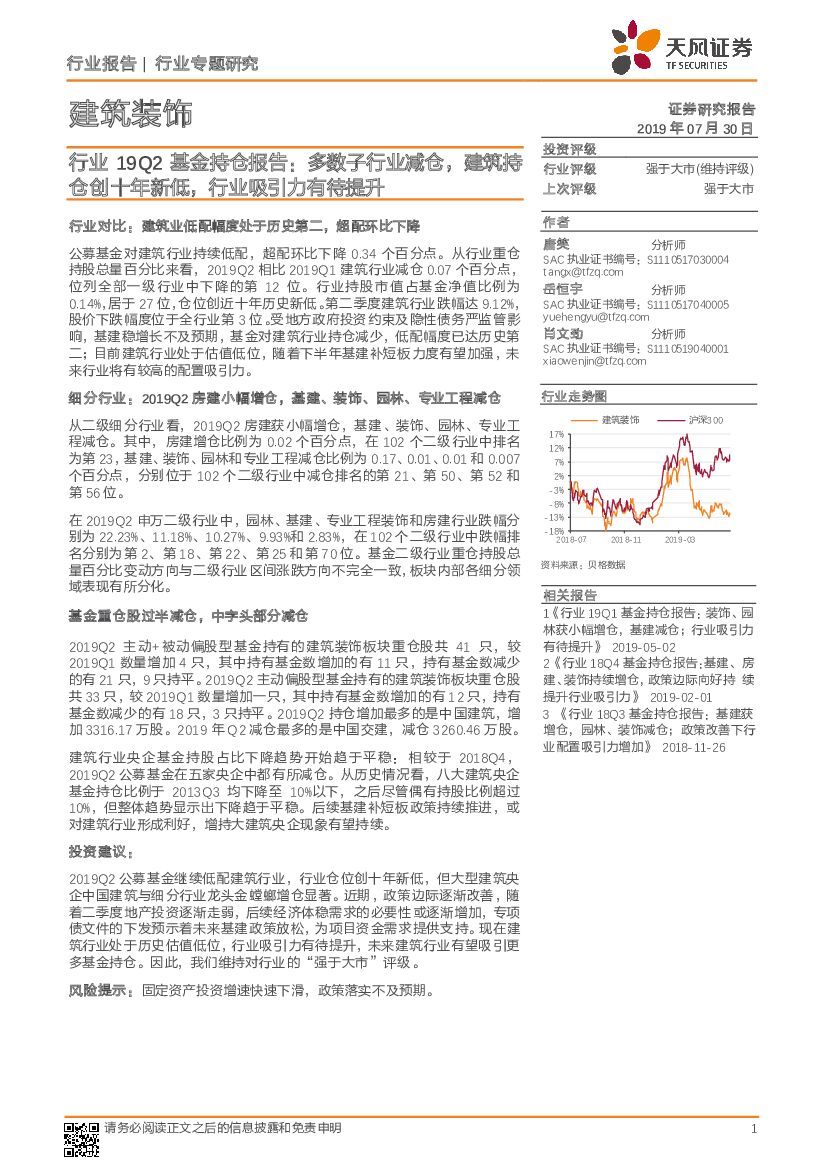 天风证券:建筑装饰行业19Q2基金持仓报告:多数子行业减仓,建筑持仓创十年新低,行业吸引力有待提升.pdf