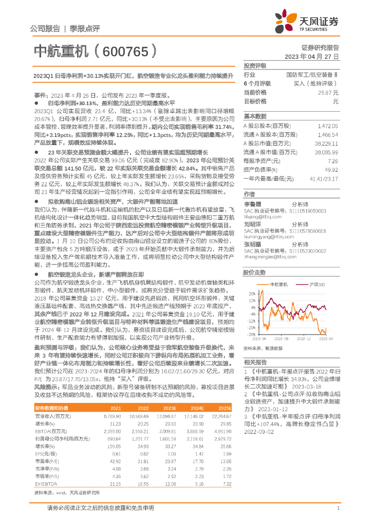 天风证券:中航重机(600765)-2023Q1归母净利润+30.13%实现开门红,航空锻造专业化龙头盈利能力持续提升.pdf