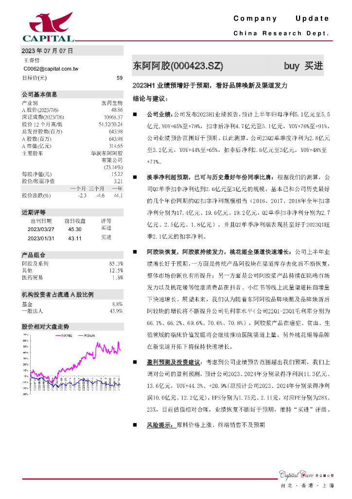 群益证券:东阿阿胶(000423)-2023H1业绩预增好于预期,看好品牌唤新及渠道发力.pdf