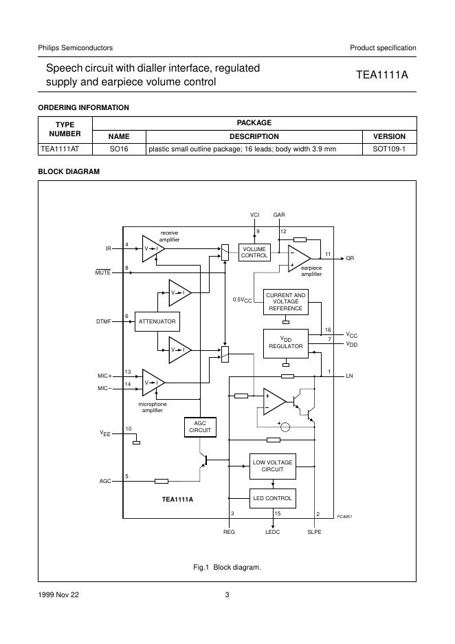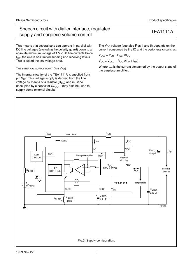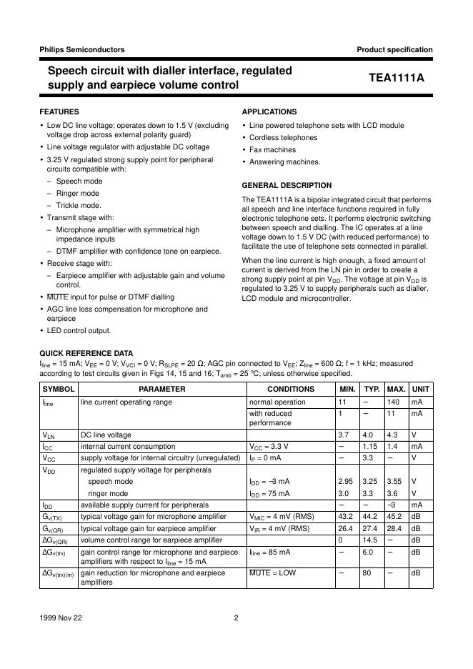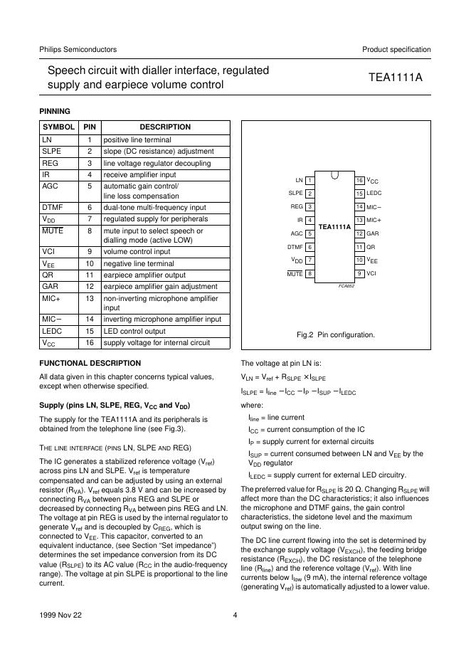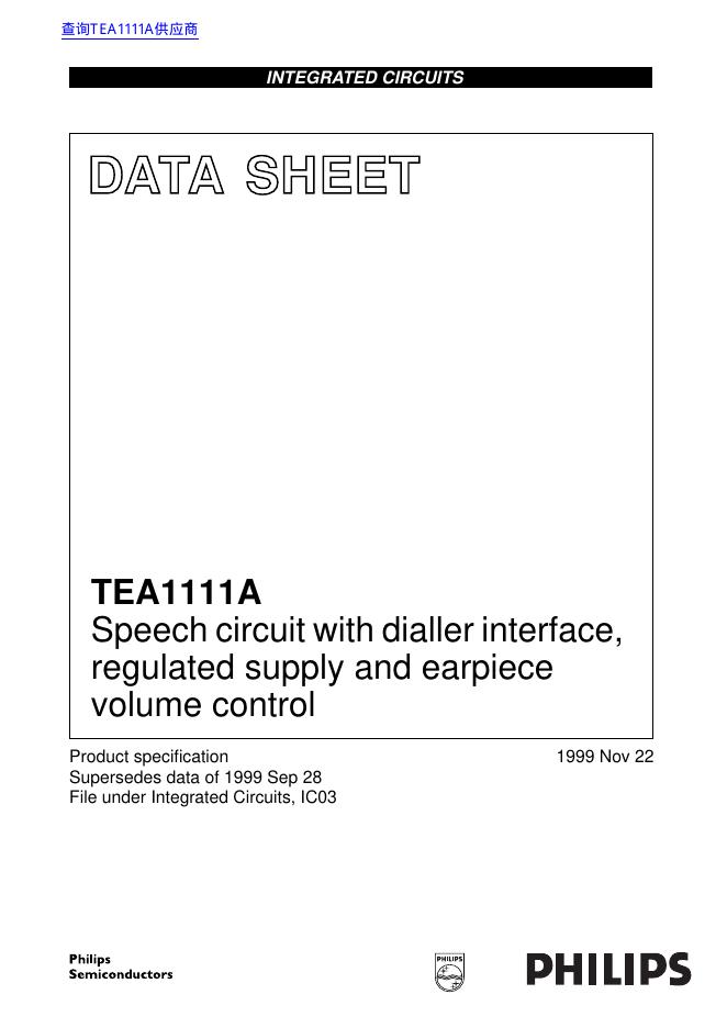 philips TEA1111A Speech circuit with dialler interface, regulated supply and earpiece volume control 数据手册.pdf