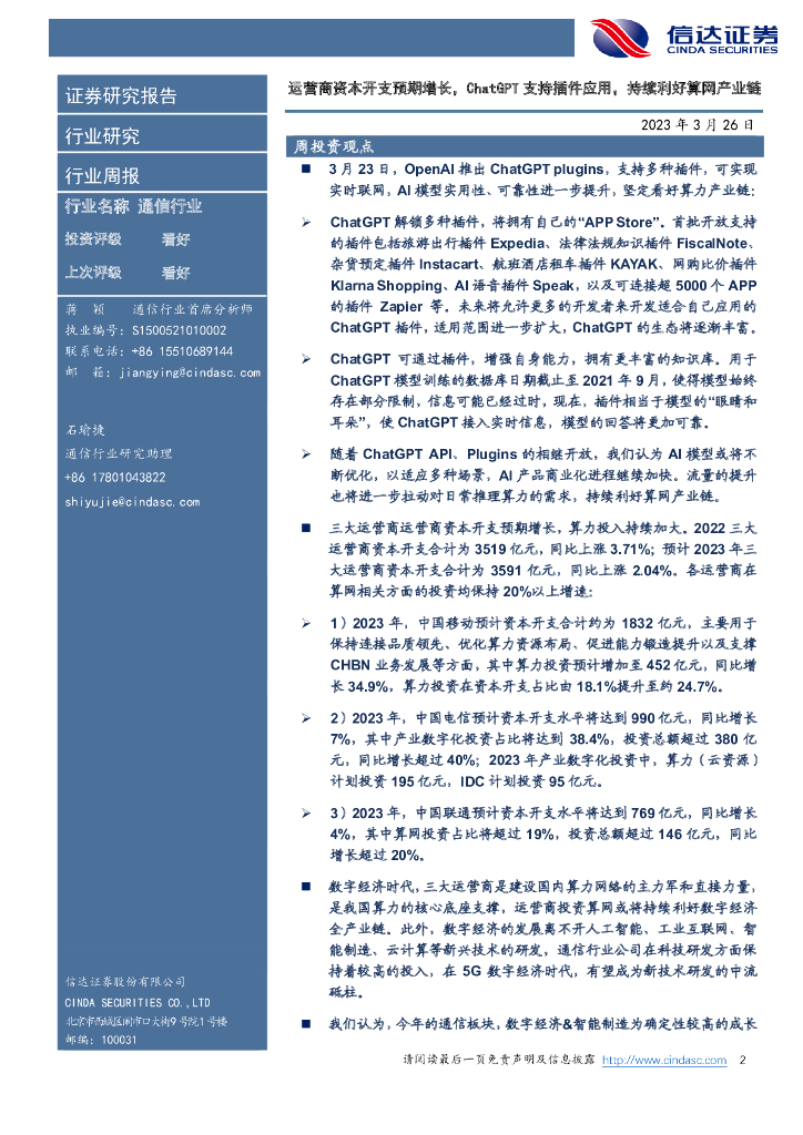 信达证券:信达通信·产业追踪(85):运营商资本开支预期增长,ChatGPT支持插件应用,持续利好算网产业链.pdf