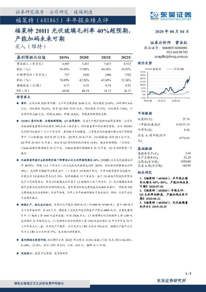 东吴证券:半年报业绩点评:福莱特20H1光伏玻璃毛利率40%超预期,产能加码未来可期.pdf