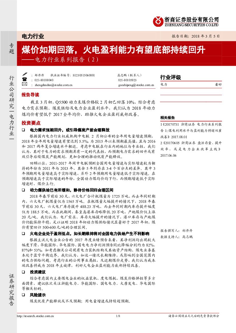 浙商证券:电力行业系列报告(2):煤价如期回落,火电盈利能力有望底部持续回升.pdf