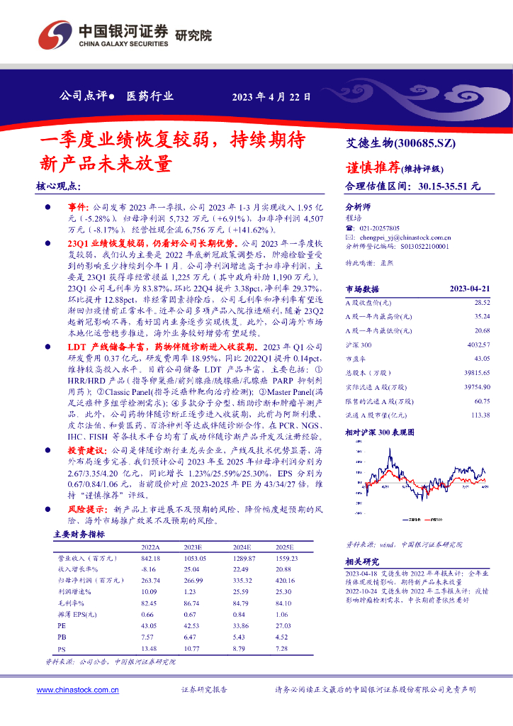 中国银河:艾德生物(300685)-一季度业绩恢复较弱,持续期待新产品未来放量.pdf