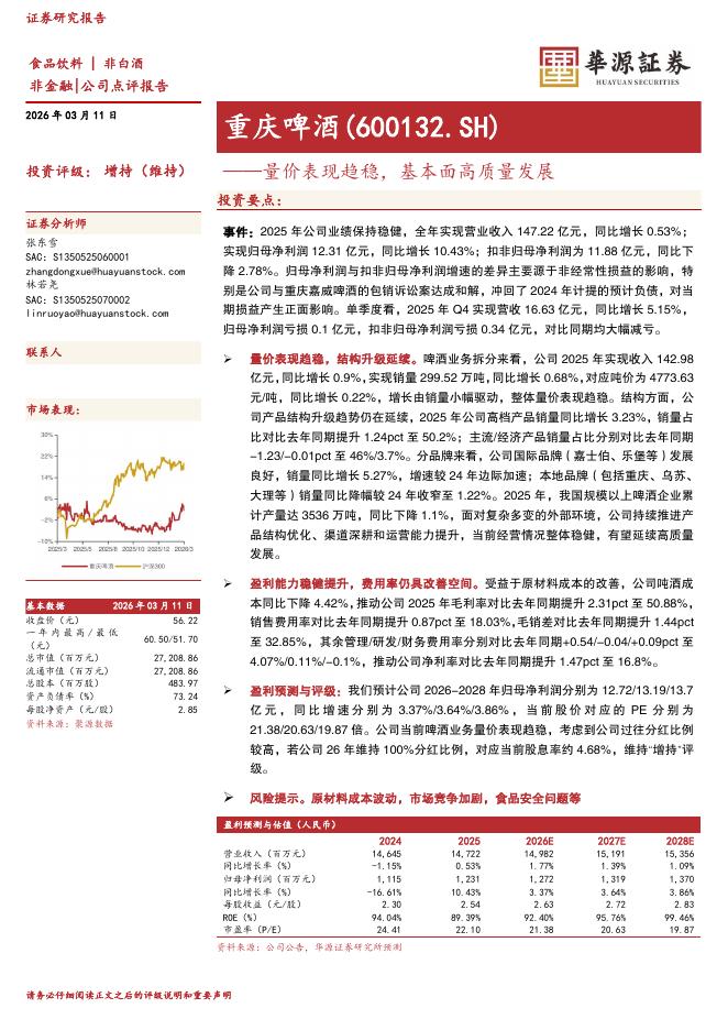 华源证券:重庆啤酒(600132)-量价表现趋稳,基本面高质量发展.pdf