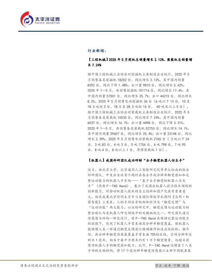 太平洋证券:机械日报:2025年5月挖机总销量增长2.12%、装载机总销量增长7.24%.pdf