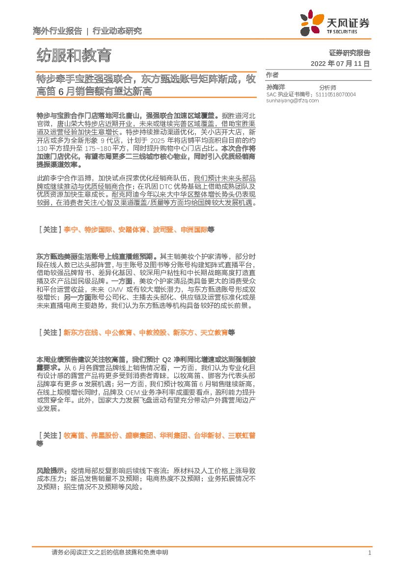 天风证券:纺服和教育:特步牵手宝胜强强联合,东方甄选账号矩阵渐成,牧高笛6月销售额有望达新高.pdf