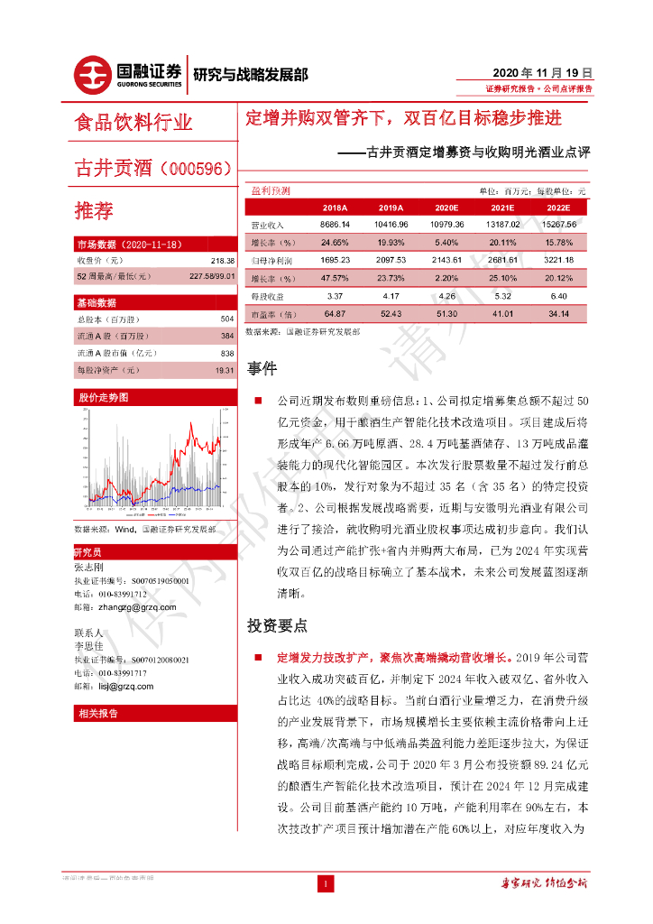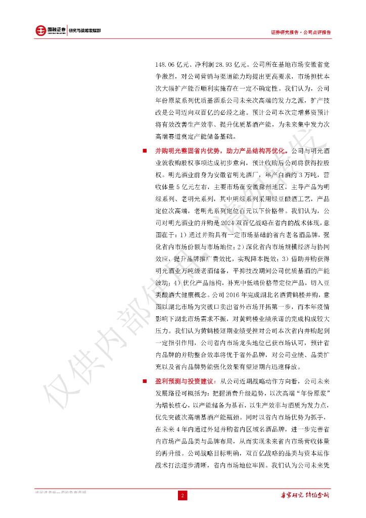 国融证券:古井贡酒定增募资与收购明光酒业点评:定增并购双管齐下,双百亿目标稳步推进.pdf