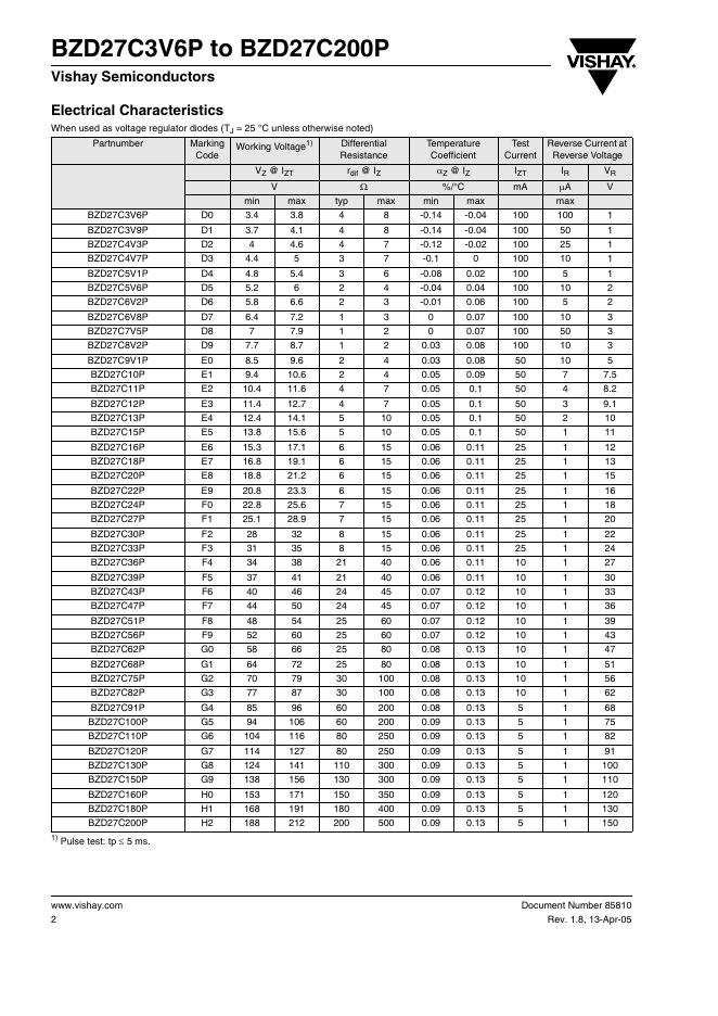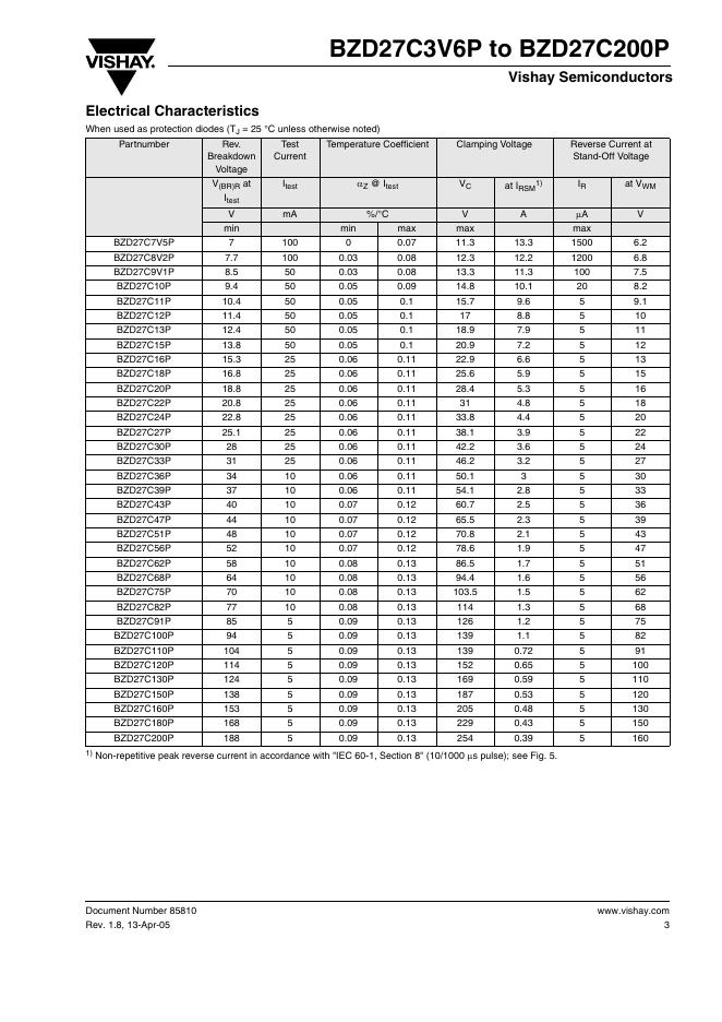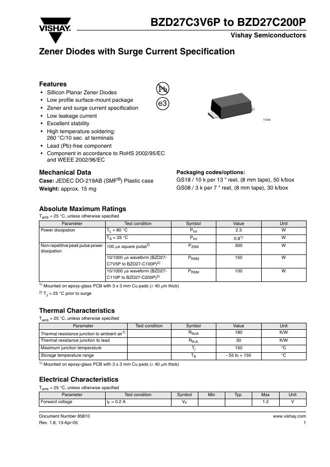 VISHAY SEMICONDUCTOR - BZD27C3V6P to BZD27C200P 数据手册.pdf