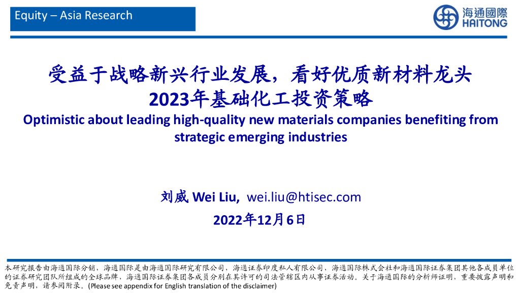 海通国际:2023年基础化工投资策略:受益于战略新兴行业发展,看好优质新材料龙头.pdf