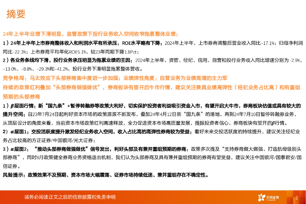 天风证券:券商2024年半年报业绩综述:供给侧改革持续深化,做优做强是未来方向.pdf