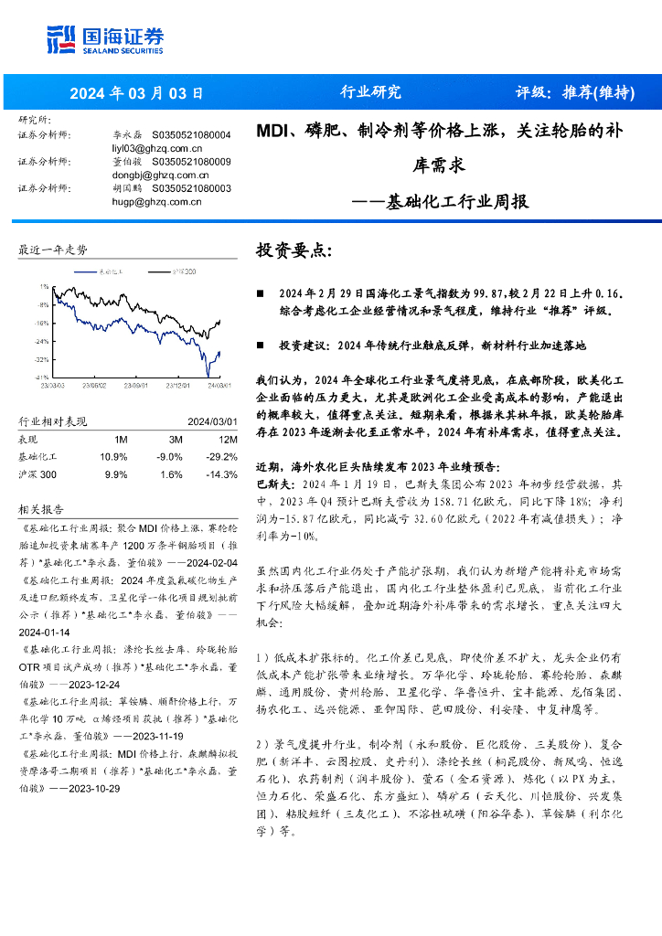 国海证券:基础化工行业周报:MDI、 磷肥、 制冷剂等价格上涨,关注轮胎的补.pdf