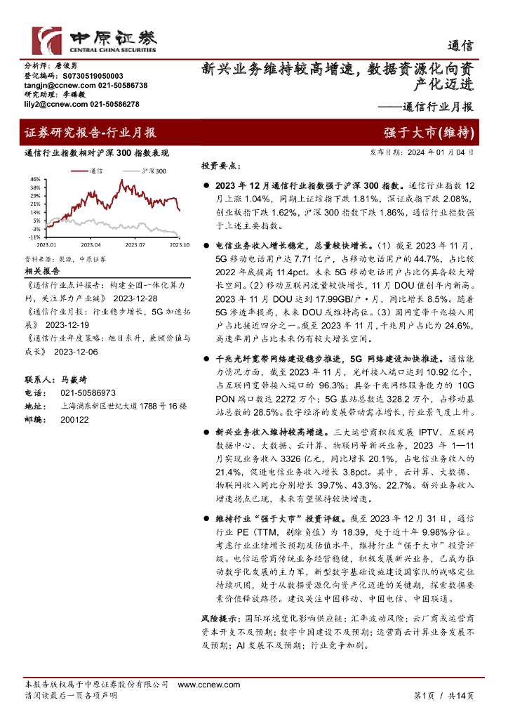 中原证券:通信行业月报:新兴业务维持较高增速,数据资源化向资产化迈进.pdf