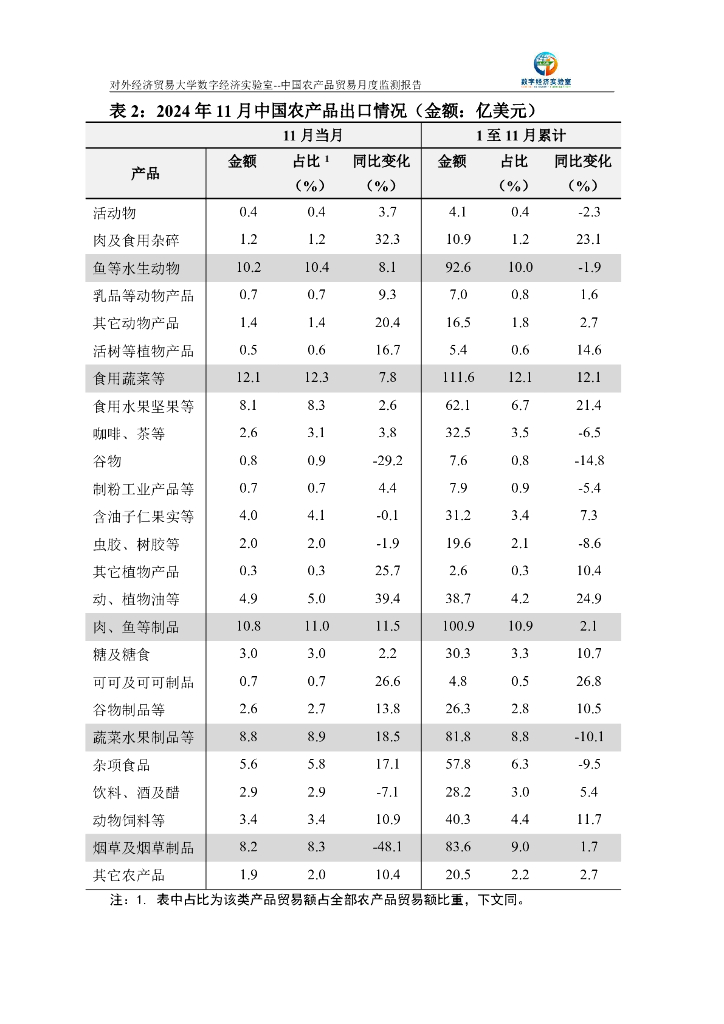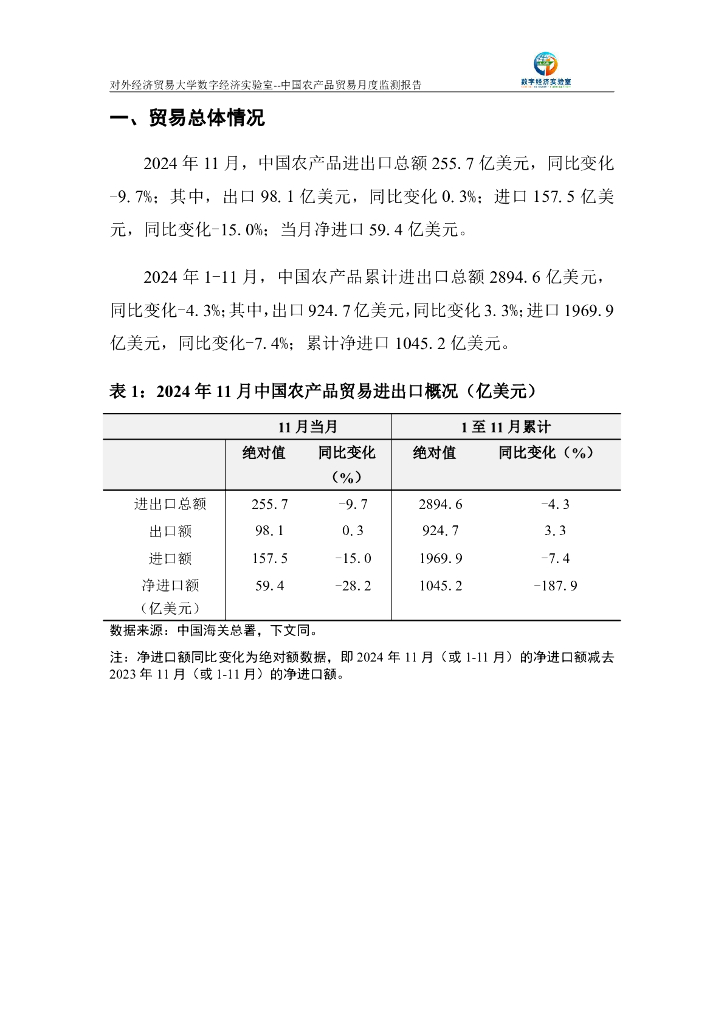对外经济贸易大学:中国农产品贸易月度监测报告(2024年1-11月).pdf