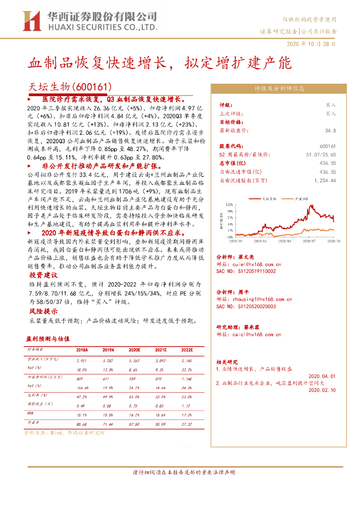 华西证券:天坛生物(600161)-血制品恢复快速增长,拟定增扩建产能.pdf
