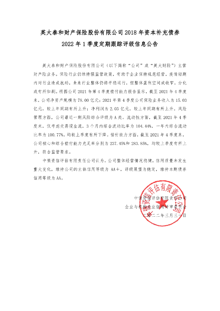 中债资信:英大泰和财产保险股份有限公司2018年资本补充债券2022年1季度定期跟踪评级信息公告.pdf